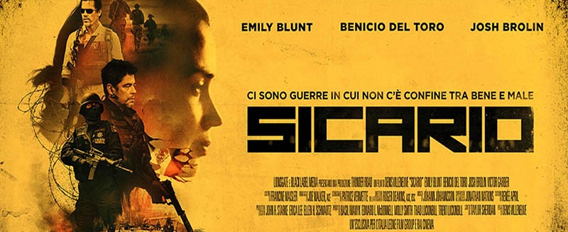 Proprio ieri ho visto in 'anteprima' grazie ad Extra di Sky e delle sue primissime, andrà infatti in onda stasera in prima visione su SkyCinema, un film di cui avevo molto sentito parlare in positivo e dopo averlo visto capisco perché è considerato uno dei migliori action degli ultimi anni, personalmente il migliore visto quest'anno, perché Sicario (selezionato per partecipare in concorso al Festival di Cannes 2015), film del 2015 diretto da Denis Villeneuve (Enemy, Prisoners e regista del prossimo Blade Runner 2049) è talmente potente, crudo e spietato da essere straordinario. Questo non solo per la parte action, comunque non eccessiva ma ugualmente spettacolare, quanto per le riflessioni morali ed etiche che questa pellicola esplora, espande ed elabora. Il film infatti come tema ha il bene e il male, non sempre paragonabili e non sempre in contrasto, a volte è la stessa cosa, perché certe volte anche dal male può uscire il bene, come in direzione contraria. Se ne accorge di ciò, Kate Macer (Emily Blunt, la protagonista a cui attorno si svolge tutta la vicenda, devota alla sua bandiera che esegue gli ordini con ingenua efficienza e che ha eletto il protocollo a suo intimo credo), giovane agente dell'FBI, che prende parte ad una delicata operazione per porre fine al narcotraffico al confine tra Stati Uniti e Messico, dopo la sconcertante scoperta (una delle scene più sconvolgenti di sempre), all'interno di una casa vittima di un'imboscata della stessa agenzia, che rivela molto più di quanto era previsto, lo spettacolo orripilante di decine di cadaveri nascosti nei muri e con la testa sigillata in sacchetti di plastica, va a caccia dei mandanti di quel massacro. Arruolata dalla CIA (anche se lei è un'esperta di rapimenti mentre la squadra combatte da tempo contro il cartello messicano della droga), viene trasferita in una speciale task force diretta dal misterioso Matt Graver (Josh Brolin, che dire di lui, basta la sua presenza davanti ad una cinepresa perché il suo personaggio funzioni, come è anche successo in Sin City: Una donna per cui uccidere, senza contare che riesce a dare perfino sfumature naif in un film come questo) e dall'ancora più misterioso Alejandro (Benicio Del Toro, misterioso procuratore di origine colombiana i cui occhi semichiusi e nevrotici nascondono un passato di sofferenza, quest'ultima vedremo lo porterà a svolgere con ossessiva solerzia i suoi 'compiti'). Da quel momento in poi le certezze di Kate su chi è "buono" e chi è "cattivo" si sgretoleranno. È l'inizio di una discesa agli inferi che coinvolgerà tutti i servizi segreti statunitensi (e la coscienza di un Paese) disposti a trasgredire ogni regola e a sacrificare ogni parvenza di umanità pur di mantenere il controllo (ma senza alcuna volontà di debellare il Male). Poiché tale operazione metterà a repentaglio le sue convinzioni più profonde e i suoi (ma anche nostri) valori morali.
